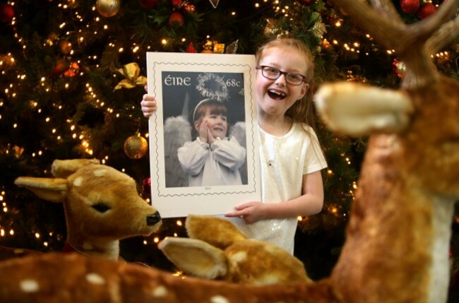 Schoolgirl Paris Curtis, 7, from Cork Street, Dublin, unveils An Post's new Christmas stamp at the GPO. Source: Brian Lawless