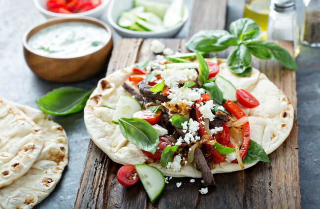 Lamp, pita and tzatziki. Shutterstock/Elena Veselova