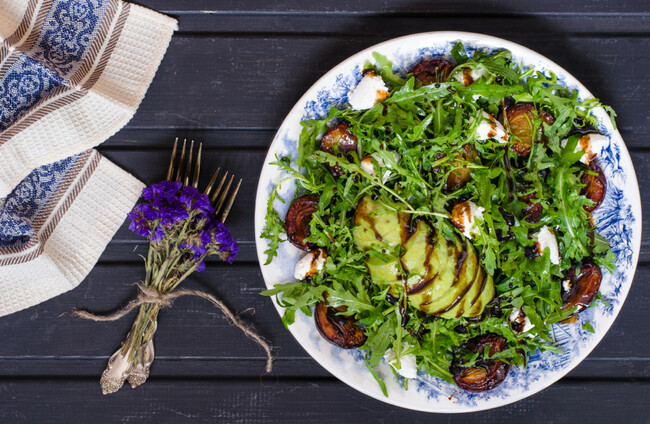 Plum and goats cheese salad: This salad is so simple to make and just an all round delicious meal! Slice the plums, place on a baking tray with a drizzle of balsamic vinegar and olive oil, and roast for 10 minutes. Set aside while you make the dressing; mix together honey, olive oil, balsamic vinegar and finely chopped red onion.