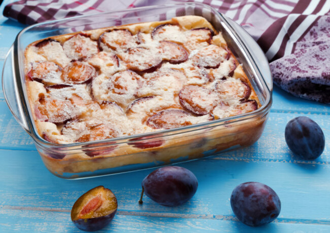 Thinly slice 5 or 6 plums, then place them in an ovenproof dish along with some butter and brown sugar, and bake for 5 minutes. Remove from the oven and pour over the batter, then cook in the oven for a further 25 minutes until the eggs have just about set. Serve warm or wait for later, if you can resist!