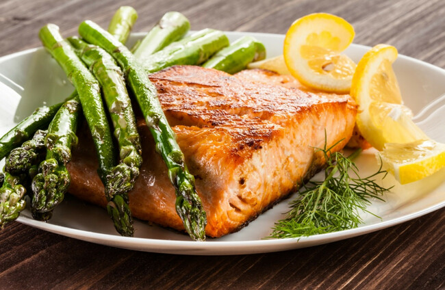 One pan salmon and asparagus: Add a splash of extra virgin olive oil to a non-stick pan, plus some dried mixed herbs, paprika, salt and pepper. Place the salmon skin side up on the heated pan. Place the asparagus around the salmon, and season with salt and pepper. Cover with a lid and let it cook on low heat until they both are well cooked. The Healthy Tart brushes some miso paste on her salmon first for more depth of flavour.