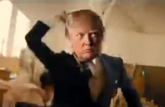 In the clip, the US president’s head is superimposed on a man opening fire in the ‘Church of Fake News’.