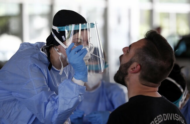 A Greek health worker takes swab samples from a tourist at the Promahonas border crossing with Bulgaria. Giannis Papanikos via PA Images