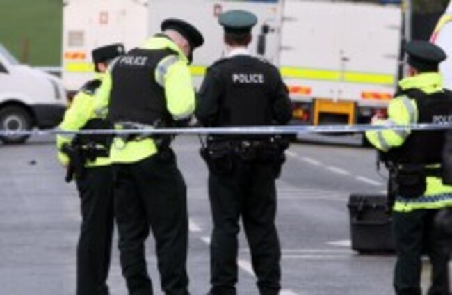 Police officers at the scene where one of their colleagues was killed in an under car booby trap explosion, in Omagh Co Tyrone. Paul Faith/PA Wire/Press Association Images
