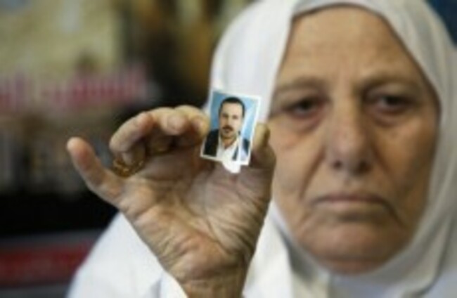 File photo of the mother of Palestinian militant Mahmoud al-Mabhouh holding up a photo of him at their home in the Jebaliya refugee camp, northern Gaza Strip. AP Photo/Hatem Moussa