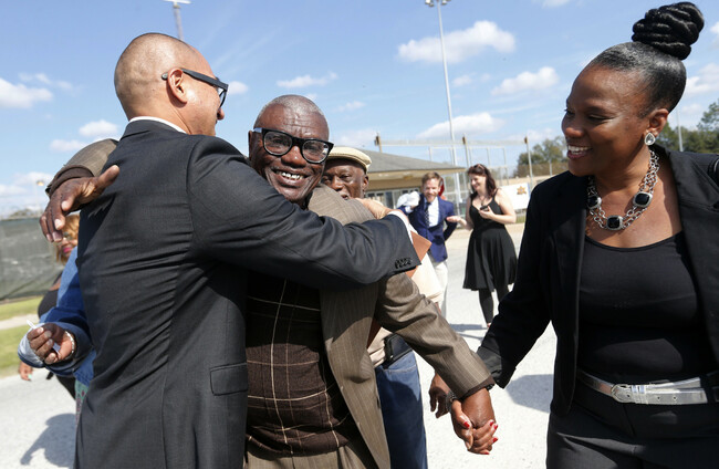 Wilbert Jones hugs friends and family as he leaves prison a free man. Gerald Herbert/AP Photo