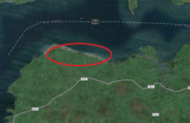 The stretch of shoreline, circled, in Co Kerry where the woman became stranded last night.
