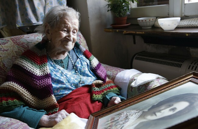 Emma Morano looks at an old portrait of herself in her apartment in Verbania, Italy. AP/Press Association Images