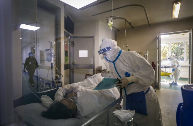 A medical worker checks on a patient at Jinyintan hospital in Wuhan. AP/PA Images