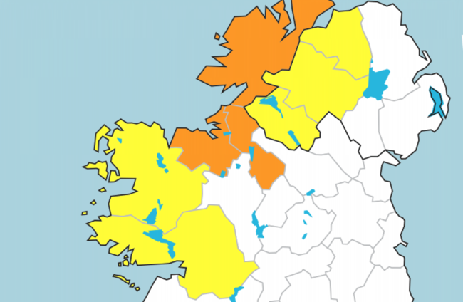 The warning comes into place for Donegal, Leitrim, and Sligo from 11am this morning and will remain in place until 12pm tomorrow.