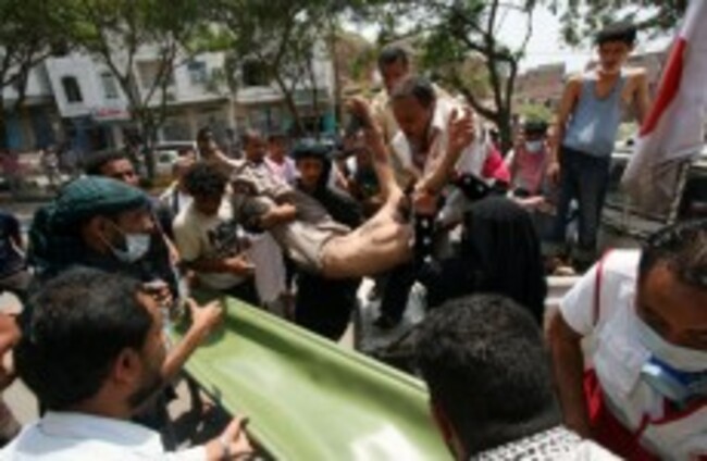 Anti-government protestors carry a wounded protestor from the site of clashes with security forces, in Taiz, Yemen, yesterday Anees Mahyoub/AP/Press Association Images