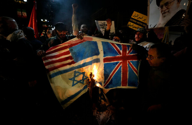 Iranian demonstrators burn representations of British, U.S. and Israeli flags during a protest against the U.S. Alamy Stock Photo