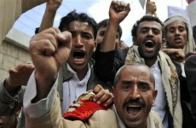 Supporters of Yemeni President Ali Abdullah Saleh react during a rally to support Saleh in Sanaa,Yemen, Friday, March 25, 2011. AP Photo/Hani Mohammed