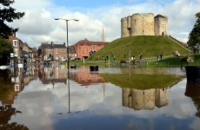 Cliffords Tower, one of York's famous ancient attractions is reflected in floodwater which this morning filled surrounding City Centre roads. John Giles/ PA Wire/Press Association Images
