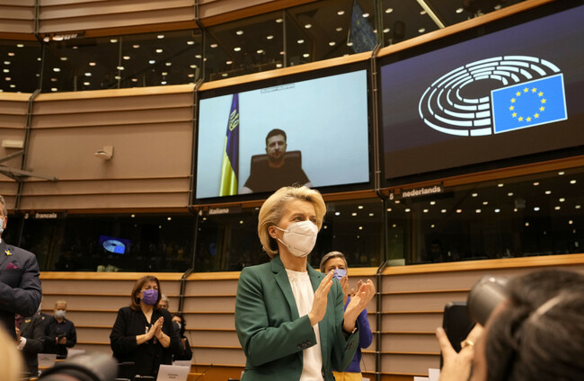 Ursula von der Leyen in the foreground as Volodymyr Zelenskyy addressed the Europen Parliament via videolink today. Virginia Mayo