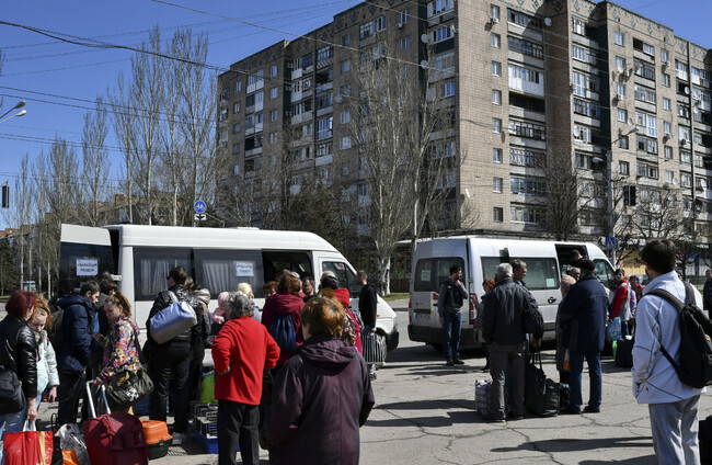 People waiting to board buses during their evacuation in Kramatorsk, Ukraine today. Andriy Andriyenko