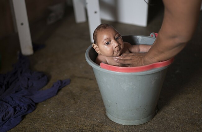 A baby with microcephaly is bathed at his home in Brazil, where the Zika virus was first detected last year. Felipe Dana/AP/Press Association Images